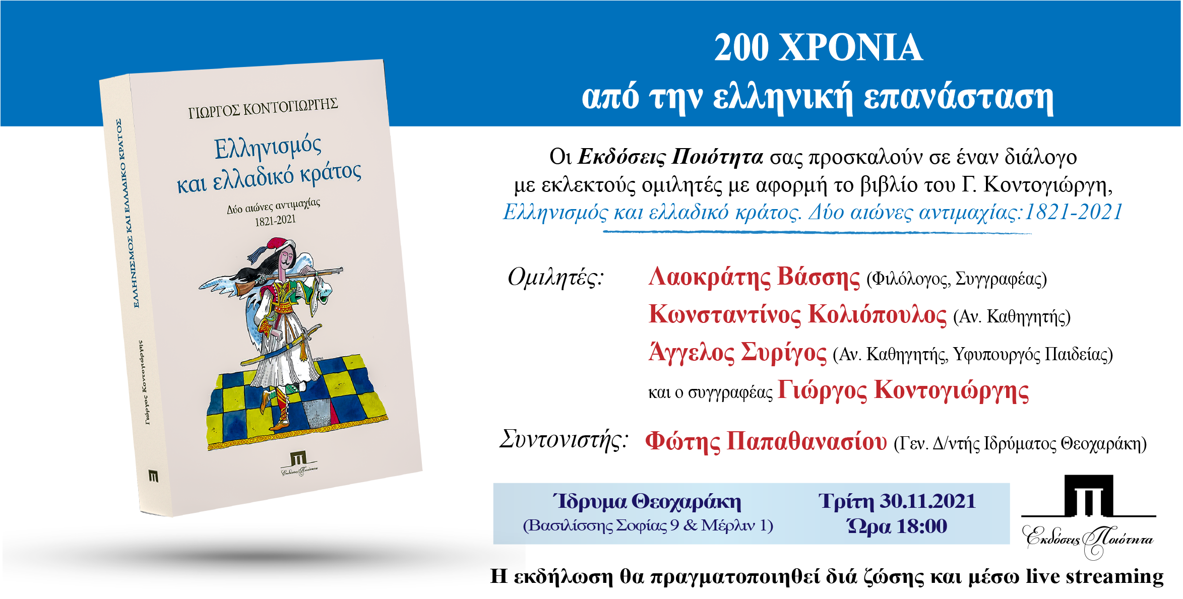 Οι Εκδόσεις Ποιότητα έχουν την τιμή να σας προσκαλέσουν σε έναν διάλογο με εκλεκτούς ομιλητές με αφορμή το βιβλίο του Γ. Κοντογιώργη, Ελληνισμός και ελλαδικό κράτος. Δύο αιώνες αντιμαχίας. 1821-2021 την Τρίτη 30 Νοεμβρίου 2021 και ώρα 18.00 στο ίδρυμα Θεοχαράκη (Βασιλίσσης Σοφίας 9 & Μέρλιν 1).